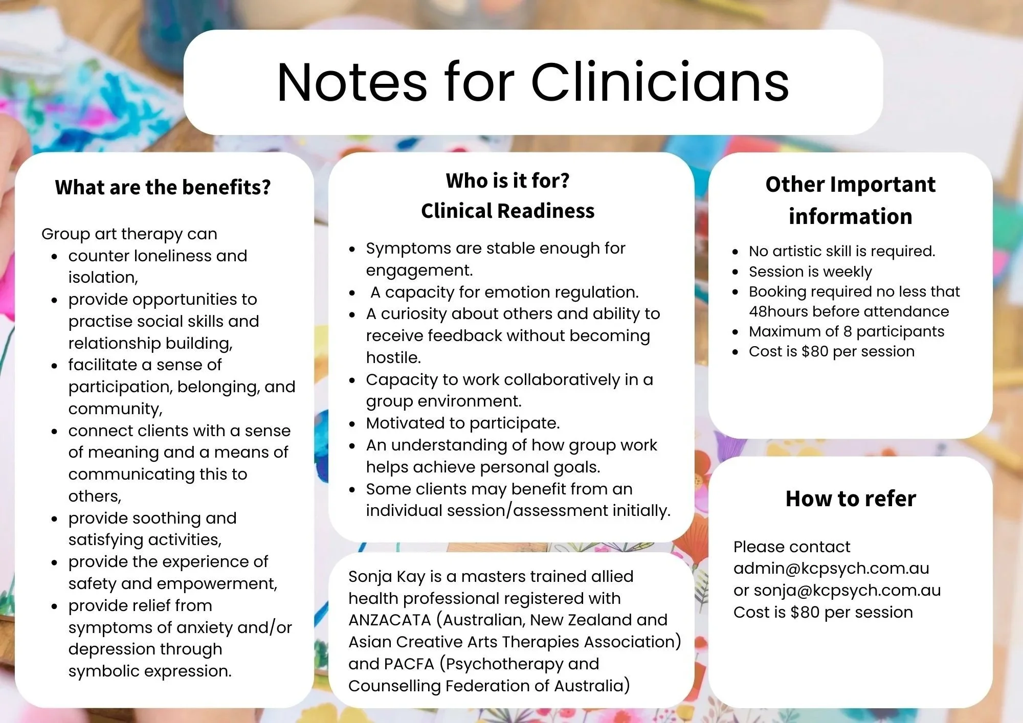 Hello, I’m Sonja Kay, a creative arts therapist. I’m genuinely passionate about using the creative process to support wellbeing. My art therapy group at KCPsych offers a safe, non-judgmental space to explore a broad range of wellbeing goals—from managing stress and anxiety to deepening self-awareness.